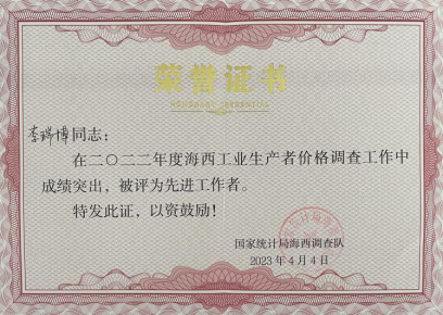 近日,風(fēng)電青海公司李瑞博獲得國家統(tǒng)計(jì)局海西調(diào)查總隊(duì)“2022年度海西工業(yè)生產(chǎn)者價格統(tǒng)計(jì)調(diào)查先進(jìn)個人”榮譽(yù)稱號,這是青海公司員工繼2018年度后再次獲得此項(xiàng)榮譽(yù)。