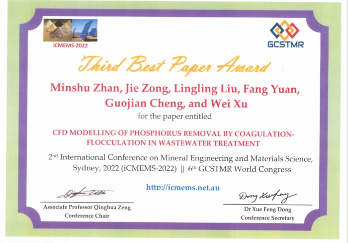 近日,基于公司牽頭承擔(dān)的集團(tuán)公司2019年度重大科技創(chuàng)新項(xiàng)目《污水處理新型藥劑開發(fā)及投加量優(yōu)化控制研究與示范》的“除磷藥劑智能投加系統(tǒng)”技術(shù)成果完成的《CFD Modelling of Phosphorus Removal by Coagulation-Flocculation in Wastewater Treatment 》論文在第2屆礦物工程與材料科學(xué)國際會(huì)議(The 2nd International Conference on Mineral Engineering and Materials Science, 簡稱iCMEMS-2022)上獲評(píng)優(yōu)秀論文(三等獎(jiǎng))。